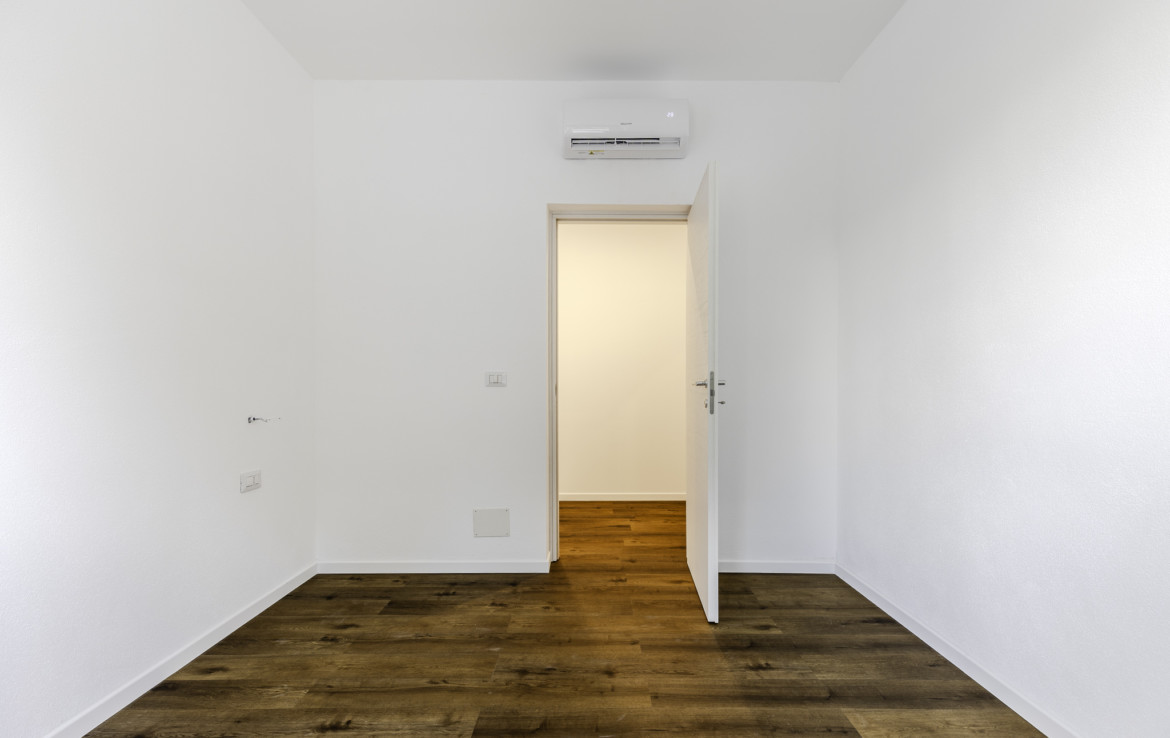 The interiors are functional and well distributed: a bright living area with kitchen, two bedrooms (one with en-suite bathroom), a generously sized main bathroom and two independent entrances. The current layout easily allows the creation of a third bedroom, further optimizing the internal spaces.