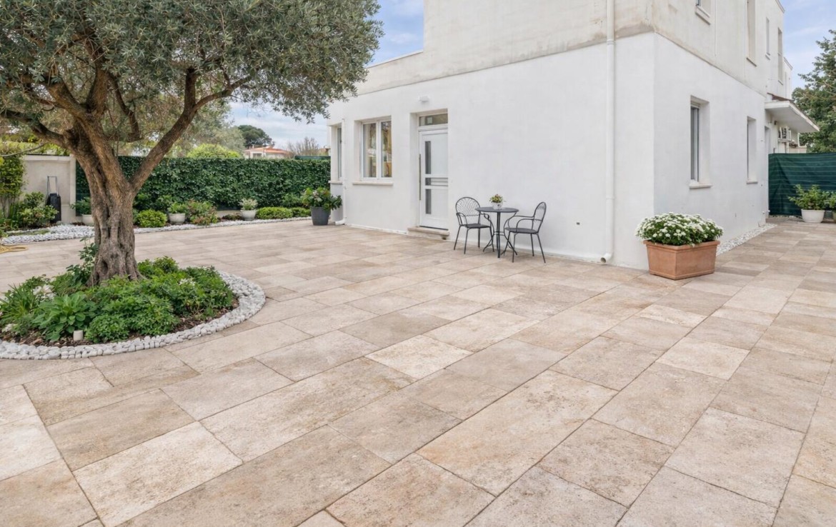 Large courtyard with olive trees and landscaped flower beds (courtyard to be repaved)