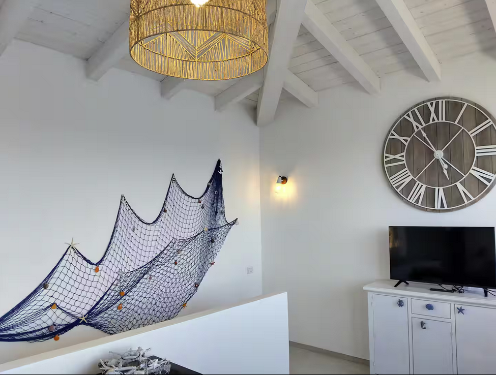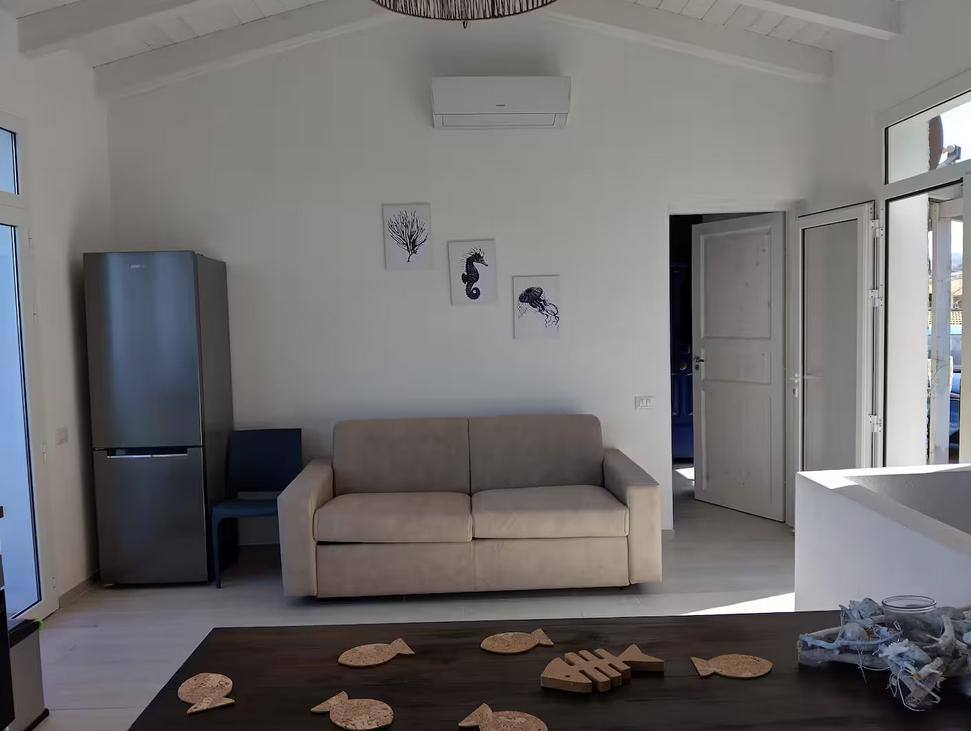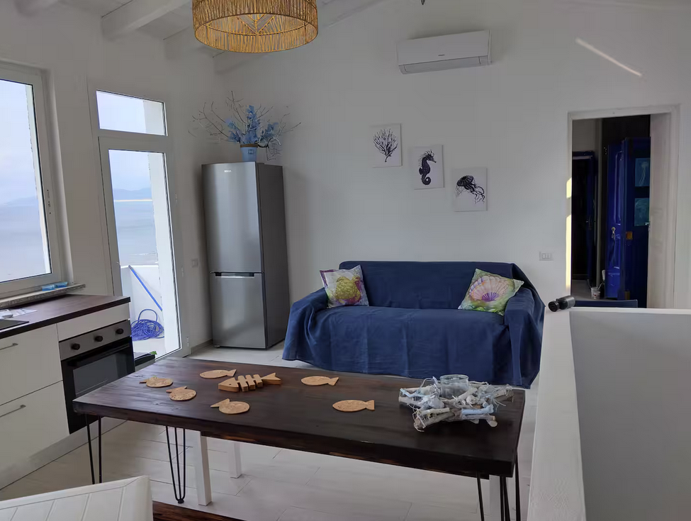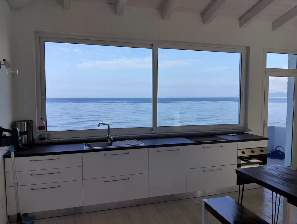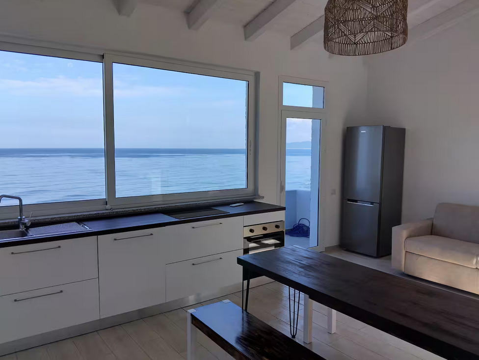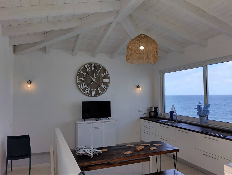 Recently renovated, the property feels brand new and is ready to host unforgettable moments. The interiors are bright and airy: the living area on the upper floor, with white exposed beams and a large panoramic window, frames the sea like a painting. The modern kitchen opens directly onto the endless blue, turning even daily routines into special experiences.