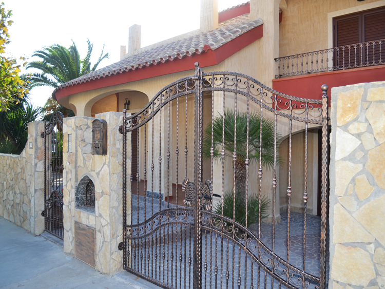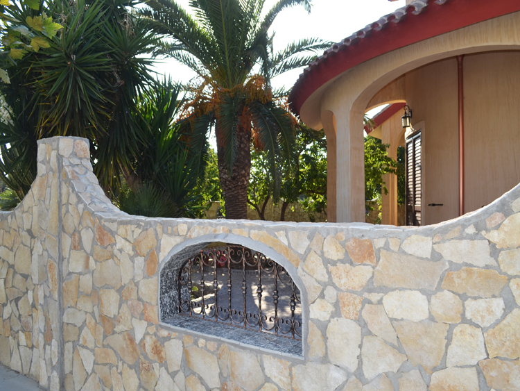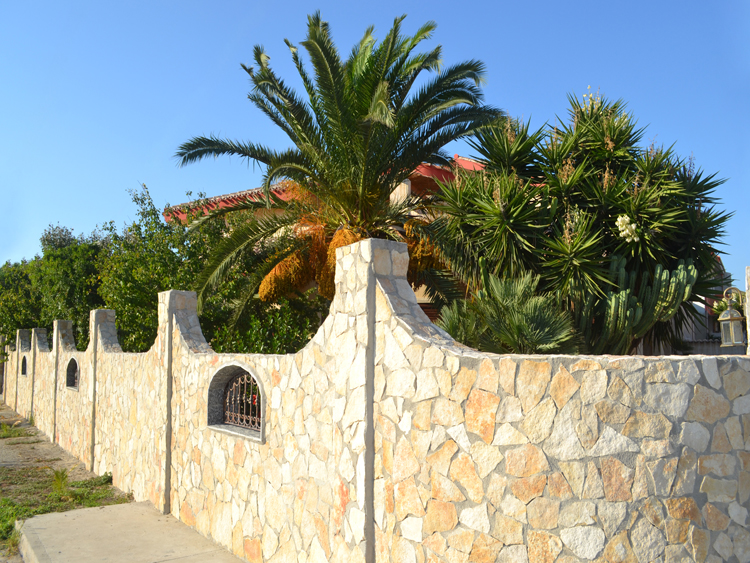 Natural stone perimeter wall with wrought iron railings ensuring both privacy and elegance