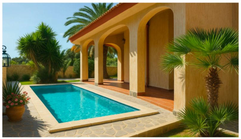 For sale in Cabras, in the heart of the Sinis peninsula and just a few kilometers from the renowned beaches of Sardinia’s western coast, a spacious detached villa with private garden and the possibility of building a swimming pool, as shown in the illustrative image.